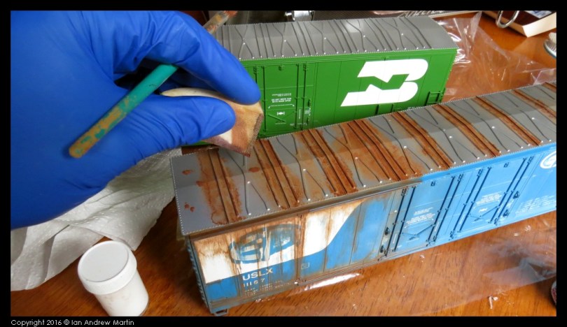 You can create specific rust spots of almost any size in the same manner. The idea is to leave the outside of the paint spot to dry first (this depends on temperature and humidity) before removing the bulk of the paint from the area with the sponge.