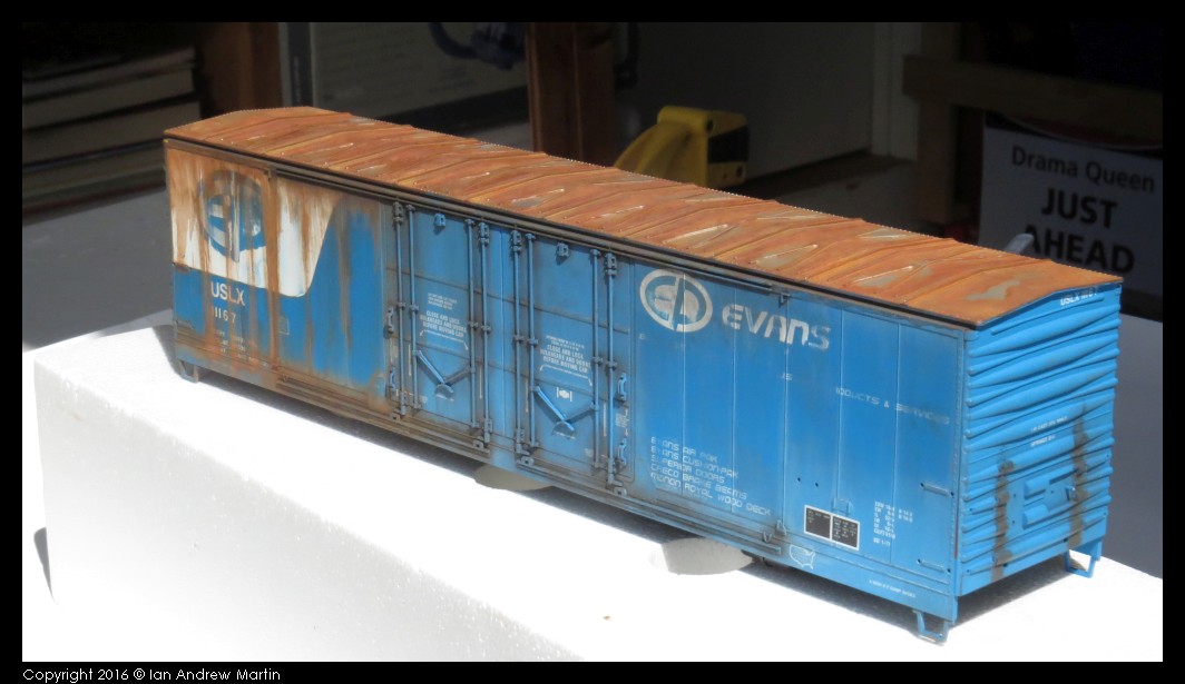 A higher 3/4 view of the car in natural afternoon light. The car colour is faded, the roof is rusty, but not rusted out and there is rust as per a prototype photo I have of a sister car on the one end. There is more dirt, oil, wear and tear on the car. Both major pad printed areas are aggressively rubbed down. Note the end of the car with the vertical stippling of rail grime from the wheel faces.