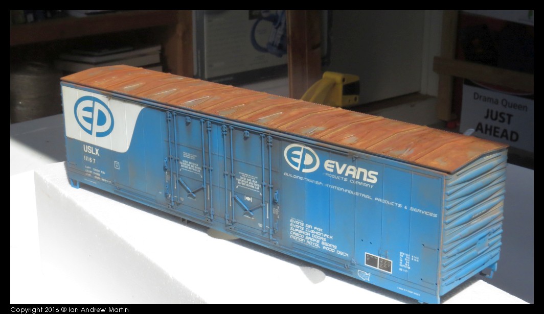 In natural afternoon sunlight a higher 3/4 view of the roof and the the lightly weathered side of the car. The car colour while faded is not beaten up, the roof is rusty, but not rusted out and there is dirt, oil, wear and tear on the car.