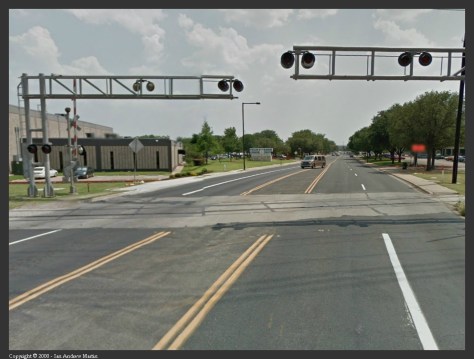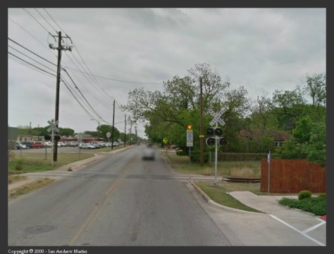 After passing the IH-35 northbound frontage road, after about 198 metres, you’d cross Governors Row at grade. There was no industrial switching in this section. Then it is on to the Woodward Street grade crossing another 466 metres away.