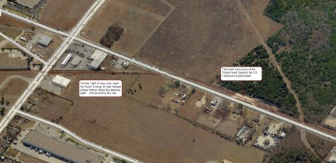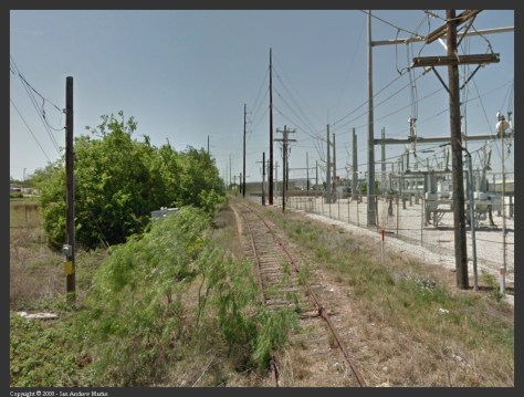 The line used to continue on to the Air Force Base (Bergstrom AFB). After the base closed the line was eventually cut back to Burleson Road. The right-of-way corridor is intact all the way through to Highway 183. Austin Energy power poles have been installed along it. Interestingly you can still see on Google Maps track in the Austin Energy yard area embedded in the concrete hardstanding.