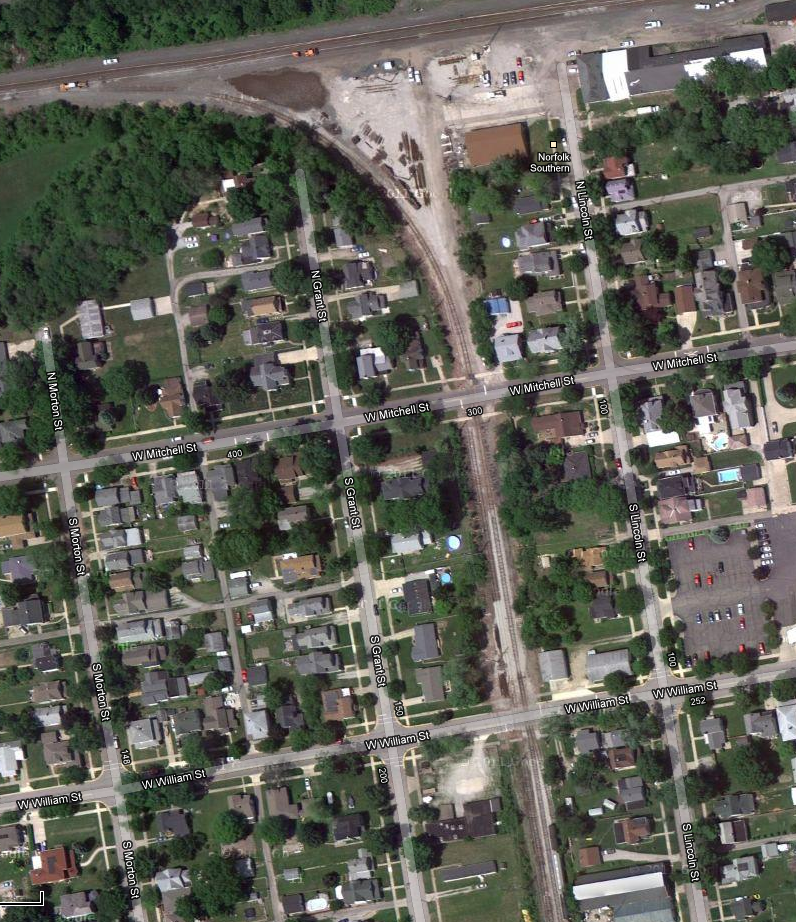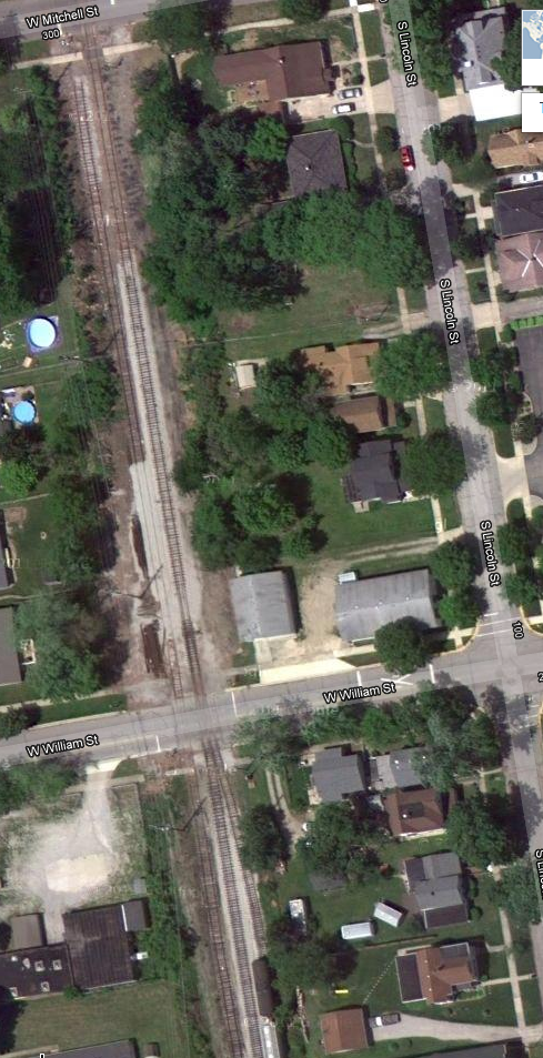 The KTR mainline continues south toward W Ohio St and the Kraft plant. Just to the north of the grade crossing is a facing point switch leading into the factory. The KTR offices (in a grounded bay window caboose) are just north of W Ohio St as well as the engine storage spot; this is so very modellable as shown in image 6 below.