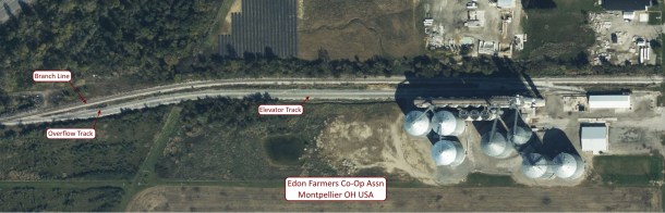 - Class 1 railroad switches a block of empty cars for loading by the elevator (pushing cars in from the yard – left of the above image). They place these cars onto the branch line (top of the picture)