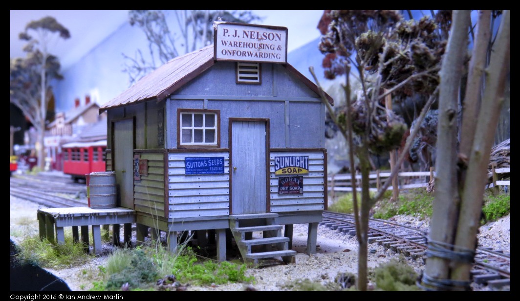 This HO scale layout displays the area around Alexandra in Melbourne’s north-east as it was in 1947, prior to the closure of the timber tramway. The track plan is the original Victorian Railways (VR) track plan. Buildings are scratchbuilt from photos with the Broad Gauge (5’3″) VR line coming in from the left side of the layout and the narrow gauge tramway coming in from the right. Each has its own fiddle yard. You can read more about the tramway by visiting the museum’s website. If you look closely you’ll see on the model the green Kelly & Lewis 0-6-0DM of 1935 in the images.